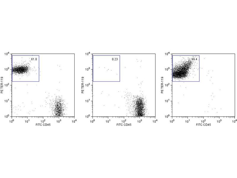 - The TER-119 antibody specifically binds to a 52 kDa molecule associated with glycophorin A on cells of the erythroid lineage in embryonic yolk sac, fetal liver, newborn liver, adult bone marrow, adult peripheral blood, and adult lymphoid organs. The TER-119 antigen is expressed on erythroid cells from pro-erythroblast through mature erythrocyte stages, but not on cells with BFU-E or CFU-E activities. The TER-119 epitope is not detected on hematopoietic stem cells, lymphoid cells, myeloid cells, or erythroleukemia lines. The TER-119 mAb is a component of the