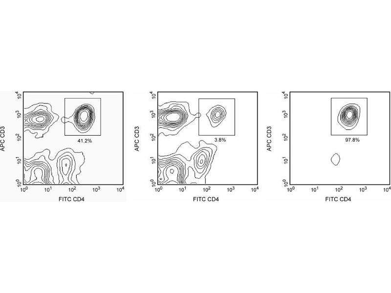 Peripheral Blood Mononuclear Cells (PBMC) are labeled with BD IMag™ anti-human CD4 Particles - DM according to the following Protocol. This labeled cell suspension is then placed within the magnetic field of the BD IMagnet™ (Cat. No. 552311). Labeled cells migrate toward the magnetic (positive fraction), leaving the unlabeled cells in suspension so they can be drawn off (negative fraction). The tube is then removed from the magnetic field for resuspension of the positive fraction. The separation is repeated twice to increase the purity of the positive fraction. The magnetic separation steps are diagrammed in the Separation Flow Chart. After the positive fraction is washed, the small size of the magnetic particles allows the positive fraction to be further evaluated in downstream applications such as flow cytometry.
