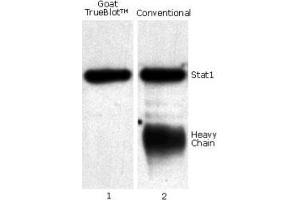 Goat IgG TrueBlot® is ideal for use in protocols involving immunoblotting of immunoprecipitated proteins. TrueBlot preferentially detects the non-reduced form of goat IgG over the reduced, SDS-denatured form of IgG. When the immunoprecipitate is fully reduced immediately prior to SDS-gel electrophoresis, reactivity of Goat IgG TrueBlot® with the 55 kDa heavy chains and the 23 kDa light chains of the immunoprecipitating antibody is minimized thereby eliminating interference by the heavy and light chains of the immunoprecipitating antibody in IP/immunoblotting applications. Applications include studies examining post-translational modification (e.g., phosphorylation or acetylation) or protein-protein interactions. Goat IgG TrueBlot may also be used for detection in immunoblotting assays that do not employ immunoprecipitation.