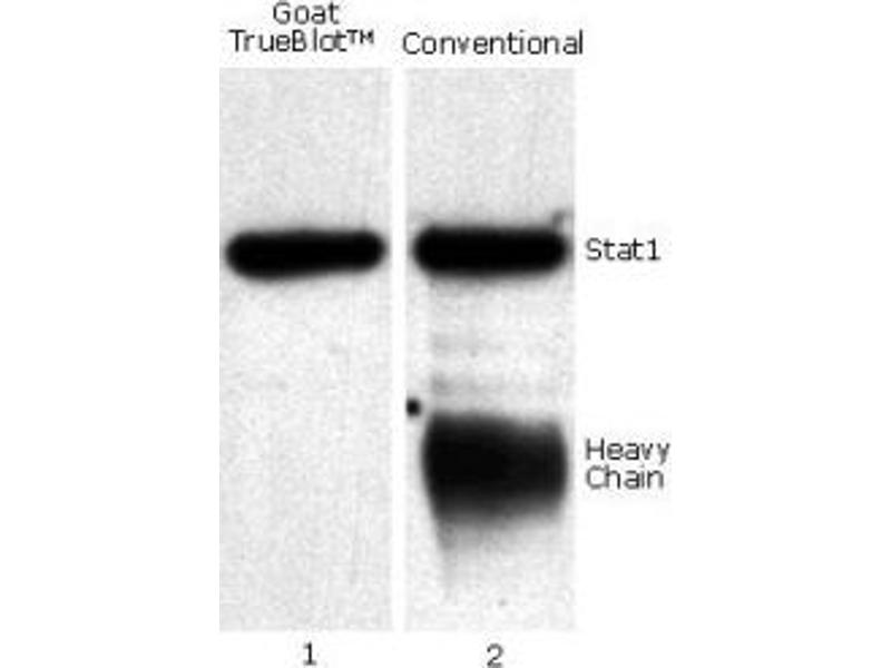 Goat IgG TrueBlot® is ideal for use in protocols involving immunoblotting of immunoprecipitated proteins. TrueBlot preferentially detects the non-reduced form of goat IgG over the reduced, SDS-denatured form of IgG. When the immunoprecipitate is fully reduced immediately prior to SDS-gel electrophoresis, reactivity of Goat IgG TrueBlot® with the 55 kDa heavy chains and the 23 kDa light chains of the immunoprecipitating antibody is minimized thereby eliminating interference by the heavy and light chains of the immunoprecipitating antibody in IP/immunoblotting applications. Applications include studies examining post-translational modification (e.g., phosphorylation or acetylation) or protein-protein interactions. Goat IgG TrueBlot may also be used for detection in immunoblotting assays that do not employ immunoprecipitation.