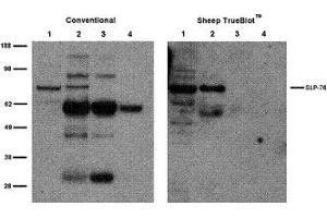 Sheep IgG TrueBlot® is ideal for use in protocols involving immunoblotting of immunoprecipitated proteins. TrueBlot preferentially detects the non-reduced form of sheep IgG over the reduced, SDS-denatured form of IgG. When the immunoprecipitate is fully reduced immediately prior to SDS-gel electrophoresis, reactivity of Sheep IgG TrueBlot® with the 55 kDa heavy chains and the 23 kDa light chains of the immunoprecipitating antibody is minimized thereby eliminating interference by the heavy and light chains of the immunoprecipitating antibody in IP/Western blotting applications. Applications include studies examining post-translational modification (e.g., phosphorylation or acetylation) or protein-protein interactions. Sheep IgG TrueBlot may also be used for detection in immunoblotting assays that do not employ immunoprecipitation.