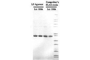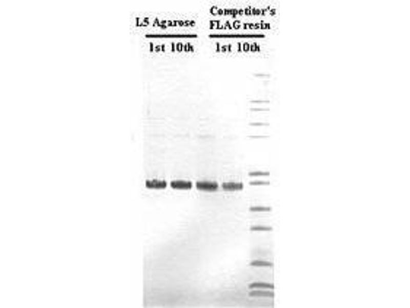 The anti-DYKDDDDK tag affinity gel is composed of the L5 antibody conjugated to an agarose resin, which can be used for purification of proteins expressing the octapeptide, DYKDDDDK. The DYKDDDDK tag, commonly referred to as Sigma®'s FLAG® Tag, is often used as a protein modification in order to simplify the labeling and detection of proteins. The binding capacity of the L5 agarose resin is greater than 0.8 mg/mL. The resin can be re-used at least five times (see technical bulletin for regeneration and storage). This affinity gel is also useful for immunoprecipitation of DYKDDDDK-tagged protein.