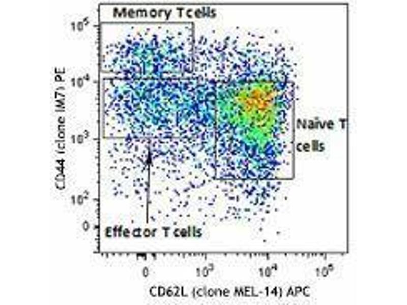 In mice, CD4+ T cells can be divided into naive and memory cells based on expression of adhesion molecules CD44 and CD62L. Naive T cells exhibit high levels of CD62L and low expression of CD44, whereas memory T cells are identified by high CD44 and low CD62L expression. This panel includes antibodies against CD3, CD4, CD62L and CD44, which can be used together to identify naive and memory T cell subsets in mice. Alterations in these subsets are evident in older mice following antigenic stimulation.