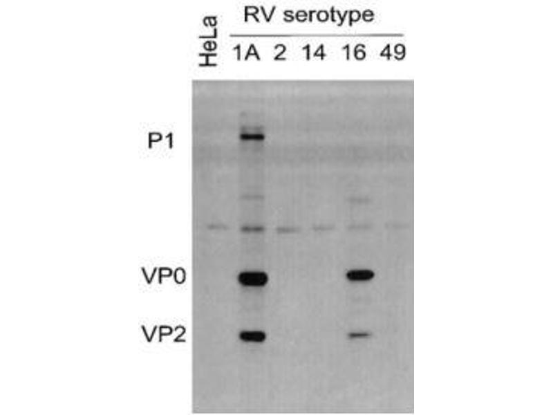 This non-neutralizing antibody recognizes capsid protein VP2 (mw ~30 kDa) of HRV16, HRV1A, and HRV39 and VP2 precursors VP0 (mw ~37 kDa) and P1 (mw ~90 kDa).