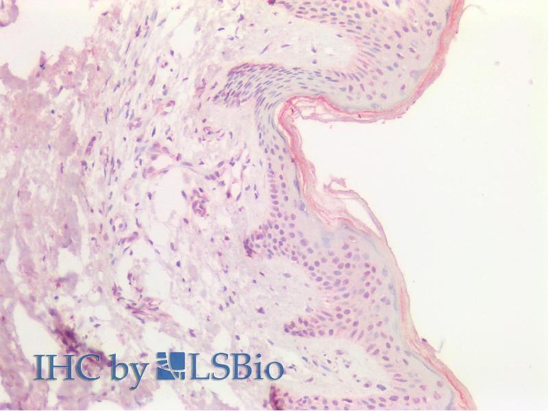 Immunohistochemistry: Paraffin embedded Human Skin. Recommended concentration: 5 μg/mL.
