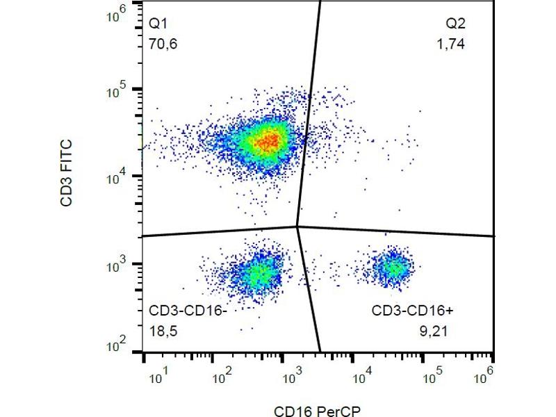 The mouse monoclonal antibody 3G8 recognizes an extracellular epitope of CD16, a low affinity receptor for aggregated IgG (FcgammaRIII antigen). CD16 exists in two different isoforms: CD16a (FcgammaRIIIA, 50-65 kDa, expressed on NK-cells, monocytes and macrophages) and CD16b (FcgammaRIIIB, 48 kDa, mainly expressed on neutrophils). Regarding CD16-158V/F polymorphism, the antibody 3G8 detects both 158V and 158F allotype on natural NK cells.