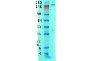 1 μg/ml of ABIN1027715 was sufficient for detection of Ankyrin-B in 20 μg of rat brain lysate by colorimetric immunoblot analysis using Goat anti-mouse IgG:HRP as the secondary antibody.