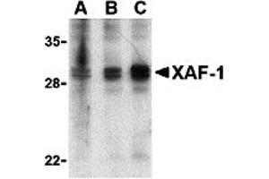 - XAF-1 antibody can be used for the detection of XAF-1 by Western blot at 1-2 μg/mL. Multiple isoforms of XAF-1 exist and a doublet at approx. 30 kDa can be seen using anti-XAF-1 (IN).