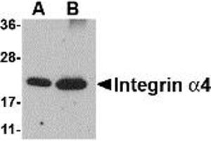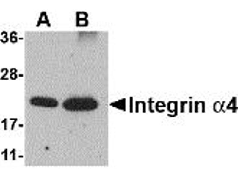 Integrin alpha 4 antibody can be used for the detection of Integrin alpha 4 by Western blot at 0.5 - 1 μg/mL. Despite its predicted molecular weight, Integrin alpha4 will often run at higher molecular weight in SDS-PAGE.