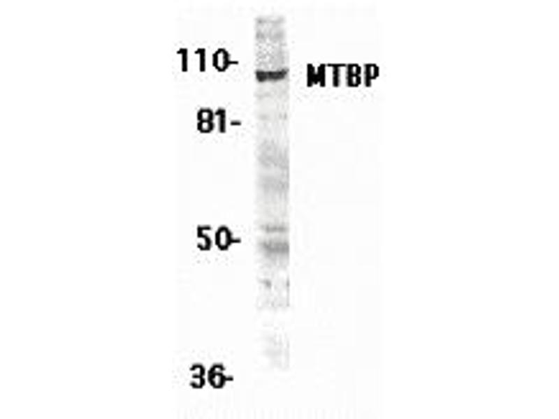 - MTBP antibody can be used for detection of MTBP by Western blot at 0.5 to 1 μg/mL. A 104 kDa band can be detected.