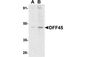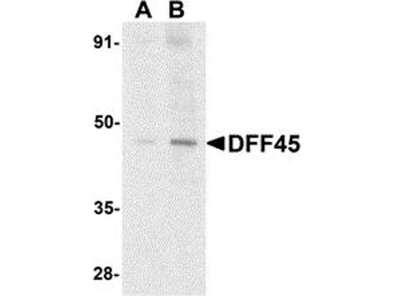 DFF45 antibody can be used for detection of DFF45, DFF35, and one the cleaved fragment by Western blot at 1:1000 to 1:2000 dilution and for immunohistochemistry. 45 and 35 kDa bands can be detected in non-apoptotic cells.