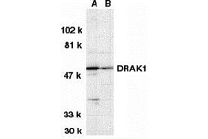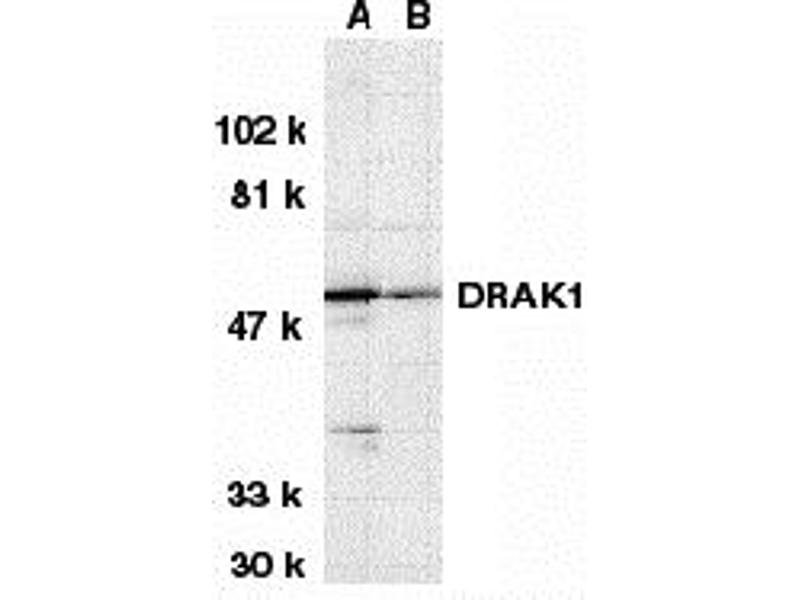 DRAK1 antibody can be used for detection of DRAK1 by Western blot at 0.5 - 1 μg/mL. An approximately 50 kDa band can be detected.