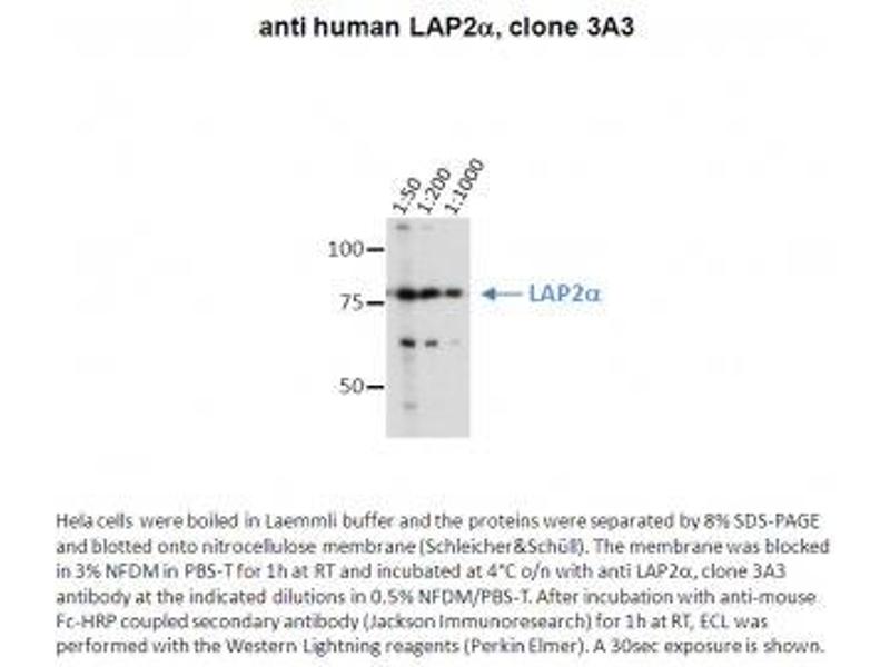 - Recognizes wt LAP2 alpha and mutant LAP2 alpha equally well.