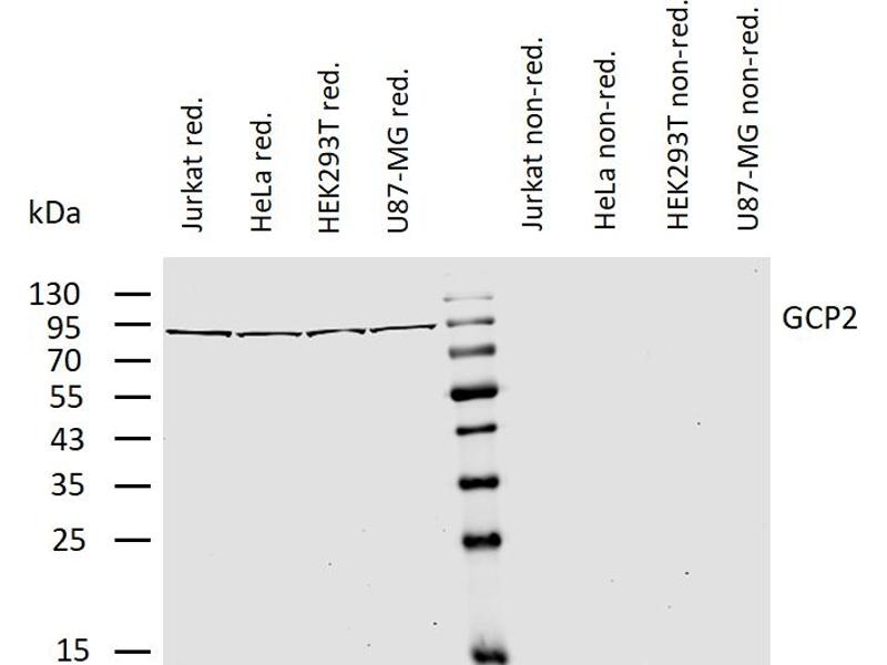 The mouse monoclonal antibody GCP2-01 recognizes gamma-tubulin complex component 2 (GCP2), a 95-103 kDa intracellular protein. It recognizes also phosphorylated GCP2.