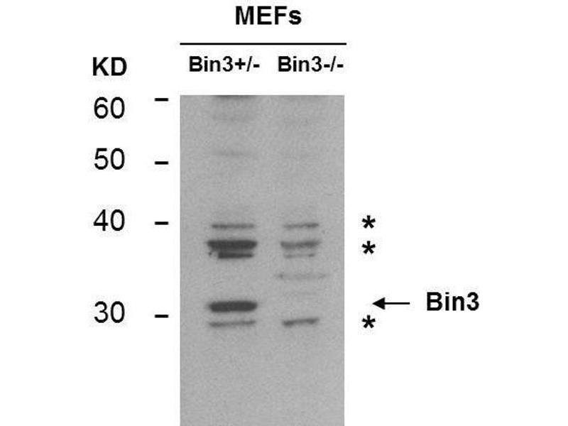 Immunogen: Anti-BIN3 (MOUSE) Monoclonal Antibody was produced in mouse by repeated immunizations with a full length human BIN3 recombinant protein followed by hybridoma development.