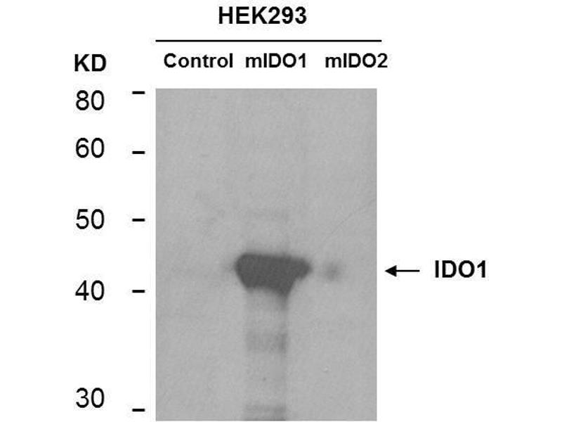 Immunogen: IDO1 antibody was produced in mouse by repeated immunizations with mouse recombinant IDO1 protein followed by hybridoma development.