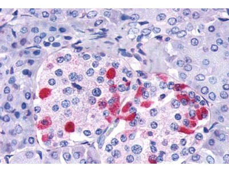 Human GIPR. BLAST analysis of the peptide immunogen showed no homology with other human proteins, except GHRHR (100 % ), GCGR (61 %), GLP2R (61 %).