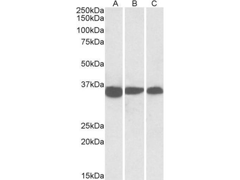 Western Blot: Approx 30 kDa band observed in lysates of cell line Jurkat (calculated MW of 28.8 kDa according to Human NP_002583.1). Approx.35 kDa band was observed in lysates of cell line NIH3T3 and in Mouse and Rat Testis, and approx 33 kDa in Pig Spleen