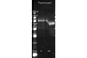 Application Note: Anti-Plasminogen antibody has been tested by ELISA and western blot. This antibody is assayed against 1.0 μg of Plasminogen in a standard capture ELISA using Peroxidase Conjugated Streptavidin #S000-03 and ABTS (2,2'-azino-bis-[3-ethylbenthiazoline-6-sulfonic acid]) code # ABTS-100 as a substrate for 30 minutes at room temperature.  A working dilution of 1:4,000 to 1:20,000 of the reconstitution concentration is suggested for this product.
