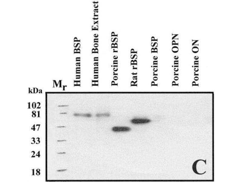 Human Bone Sialoprotein, recombinant human BSP, recombinant porcine BSP, and recombinant rat BSP. There were no cross reactivities obtained with human Osteonectin, and human Osteopontin