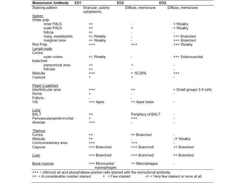 - This Monoclonal Antibody ED1 is useful for detecting Rat monocytes and macrophages and isolated dendritic (veiled) cells in the blood. The antibody recognises a single chain glycoprotein of 90-100 kDa. Weak cell surface expression also occurs. The antigen is expressed by the majority of tissue macrophages and weakly by peripheral blood granulocytes. Studies have shown that the antigen recognised by ED1 has many characteristics in common with Mouse macrosialin and Human CD68. Antigen, Epitope: CD68, ED1 recognises a 92 kDa cytoplasmic protein. The epitope has not been further characterized. Antigen Distribution: The antigen is found on 90 % of monocytes in the peripheral blood. It is also expressed by 98 % of isolated dendritic (veiled) cells.