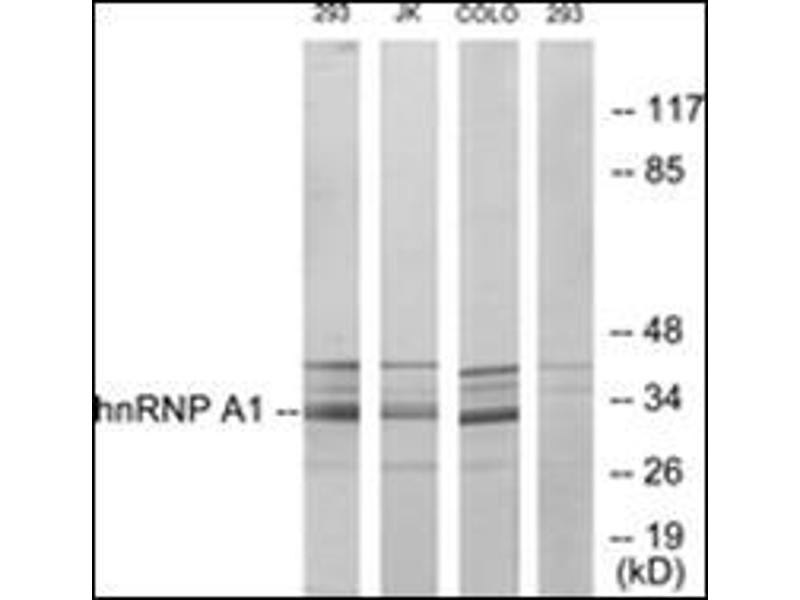 HnRNP A1 belongs to the A/B subfamily of ubiquitously expressed heterogeneous nuclear ribonucleoproteins (hnRNPs). The hnRNPs are RNA binding proteins and they complex with heterogeneous nuclear RNA (hnRNA). These proteins are associated with pre mRNAs in the nucleus and appear to influence pre mRNA processing and other aspects of mRNA metabolism and transport. While all of the hnRNPs are present in the nucleus, some seem to shuttle between the nucleus and the cytoplasm. The hnRNP proteins have distinct nucleic acid binding properties. hnRNP A1 has two repeats of quasi RRM domains that bind to RNAs. It is one of the most abundant core proteins of hnRNP complexes and it is localized to the nucleoplasm. This protein, along with other hnRNP proteins, is exported from the nucleus, probably bound to mRNA, and is immediately re imported.Synonyms: HNRPA1, Helix-destabilizing protein, Heterogeneous nuclear ribonucleoprotein A1, Single-strand RNA-binding protein, hnRNP-A1