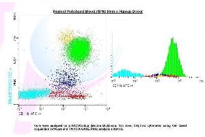 - 1. Transfer 100 µl of anticoagulated (EDTA) blood to a 12 x 75 mm polystyrene test tube (10^6 cells). 2. Add 20 µl of CD11b APC and mix gently with a vortex mixer. The 20 µl is a guideline only, the optimal volume should be determined by the individual laboratory. 3. The recommended negative control is a non-reactive APC-conjugated antibody of the same isotype. 4. Incubate in the dark at room temperature at 4°C for 30 minutes or at room temperature (20-25 °C) for 15 minutes. 5. Add 100 µl of Lysing Solution to each sample and mix gently with a vortex mixer. Incubate for 10 minutes at room temperature in the dark. 6. Centrifuge at 1000 x g for 5 minutes. Gently aspirate the supernatant and discard it leaving approximately 50 µl of fluid. 7. Add 2 ml 0.01 mol/l PBS ( It better that it containing 2% bovine serum albumin) and resuspend the cells by using a vortex mixer. 8. Centrifuge at 1000 x g for 5 minutes. Gently aspirate the supernatant and discard it leaving approximately 50 µl of fluid. 9. Resuspend pellet in an appropriate fluid for flow cytometry, e.g. 0.3 ml PBS. The PBS should contain 1% paraformaldehyde (fixative) if samples are not analysed the same day. 10. Analyse on a flow cytometer or store at 2-8 °C in the dark until analysis. Samples can be run up to 24 hours after lysis. Normal Blood Sample from a Human Donor