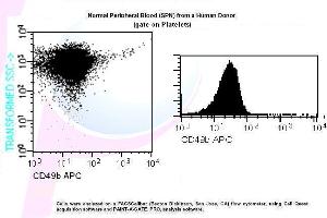 - Transfer 100 µl of anticoagulated (EDTA) blood to a 12 x 75 mm polystyrene test tube (10^6 cells). 2. Add 20 µl of CD49b APC and mix gently with a vortex mixer. The 20 µl is a guideline only, the optimal volume should be determined by the individual laboratory. 3. The recommended negative control is a non-reactive APC-conjugated antibody of the same isotype. 4. Incubate in the dark at room temperature at 4°C for 30 minutes or at room temperature (20-25 °C) for 15 minutes. 5. Add 1,5 ml of Lysing Solution to each sample and mix gently with a vortex mixer. Incubate for 10 minutes at room temperature in the dark. 6. Centrifuge at 1000 x g for 5 minutes. Gently aspirate the supernatant and discard it leaving approximately 50 µl of fluid. 7. Add 2 ml 0.01 mol/l PBS (It betters that it containing 2% bovine serum albumin) and resuspend the cells by using a vortex mixer. 8. Centrifuge at 1000 x g for 5 minutes. Gently aspirate the supernatant and discard it leaving approximately 50 µl of fluid. 9. Resuspend pellet in an appropriate fluid for flow cytometry, e.g. 0.3 ml PBS. The PBS should contain 1% paraformaldehyde (fixative) if samples are not analysed the same day. 10. Analyse on a flow cytometer or store at 2-8 °C in the dark until analysis. Samples can be run up to 24 hours after lysis.