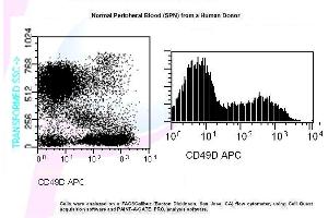 - Transfer 100 µl of anticoagulated (EDTA) blood to a 12 x 75 mm polystyrene test tube (10^6 cells). 2. Add 20 µl of CD49d APC and mix gently with a vortex mixer. The 20 µl is a guideline only, the optimal volume should be determined by the individual laboratory. 3. The recommended negative control is a non-reactive APC-conjugated antibody of the same isotype. 4. Incubate in the dark at room temperature at 4°C for 30 minutes or at room temperature (20-25 °C) for 15 minutes. 5. Add 1,5 ml of Lysing Solution to each sample and mix gently with a vortex mixer. Incubate for 10 minutes at room temperature in the dark. 6. Centrifuge at 1000 x g for 5 minutes. Gently aspirate the supernatant and discard it leaving approximately 50 µl of fluid. 7. Add 2 ml 0.01 mol/l PBS (It better that it containing 2% bovine serum albumin) and resuspend the cells by using a vortex mixer. 8. Centrifuge at 1000 x g for 5 minutes. Gently aspirate the supernatant and discard it leaving approximately 50 µl of fluid. 9. Resuspend pellet in an appropriate fluid for flow cytometry, e.g. 0.3 ml PBS. The PBS should contain 1% paraformaldehyde (fixative) if samples are not analysed the same day. 10. Analyse on a flow cytometer or store at 2-8 °C in the dark until analysis. Samples can be run up to 24 hours after lysis.