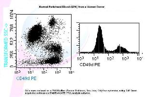 - Transfer 100 µl of anticoagulated (EDTA) blood to a 12 x 75 mm polystyrene test tube (10^6 cells). 2. Add 20 µl of CD49d PE and mix gently with a vortex mixer. The 20 µl is a guideline only, the optimal volume should be determined by the individual laboratory. 3. The recommended negative control is a non-reactive PE-conjugated antibody of the same isotype. 4. Incubate in the dark at room temperature at 4°C for 30 minutes or at room temperature (20-25 °C) for 15 minutes. 5. Add 1,5 ml of Lysing Solution to each sample and mix gently with a vortex mixer. Incubate for 10 minutes at room temperature in the dark. 6. Centrifuge at 1000 x g for 5 minutes. Gently aspirate the supernatant and discard it leaving approximately 50 µl of fluid. 7. Add 2 ml 0.01 mol/l PBS (It better that it containing 2% bovine serum albumin) and resuspend the cells by using a vortex mixer. 8. Centrifuge at 1000 x g for 5 minutes. Gently aspirate the supernatant and discard it leaving approximately 50 µl of fluid. 9. Resuspend pellet in an appropriate fluid for flow cytometry, e.g. 0.3 ml PBS. The PBS should contain 1% paraformaldehyde (fixative) if samples are not analysed the same day. 10. Analyse on a flow cytometer or store at 2-8 °C in the dark until analysis. Samples can be run up to 24 hours after lysis.