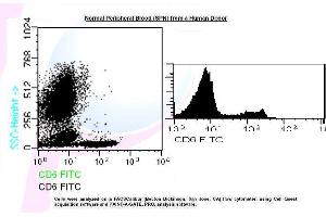 - 1. Transfer 100 µl of anticoagulated (EDTA) blood to a 12 x 75 mm polystyrene test tube (10^6 cells). 2. Add 20 µl of CD6 FITC and mix gently with a vortex mixer. The 20 µl is a guideline only, the optimal volume should be determined by the individual laboratory. 3. The recommended negative control is a non-reactive FITC-conjugated antibody of the same isotype. 4. Incubate in the dark at room temperature at 4°C for 30 minutes or at room temperature (20-25 °C) for 15 minutes. 5. Add 1,5 ml of Lysing Solution to each sample and mix gently with a vortex mixer. Incubate for 10 minutes at room temperature in the dark. 6. Centrifuge at 1000 x g for 5 minutes. Gently aspirate the supernatant and discard it leaving approximately 50 µl of fluid. 7. Add 2 ml 0.01 mol/l PBS (It betters that it containing 2% bovine serum albumin) and resuspend the cells by using a vortex mixer. 8. Centrifuge at 1000 x g for 5 minutes. Gently aspirate the supernatant and discard it leaving approximately 50 µl of fluid. 9. Resuspend pellet in an appropriate fluid for flow cytometry, e.g. 0.3 ml PBS. The PBS should contain 1% paraformaldehyde (fixative) if samples are not analysed the same day. 10. Analyse on a flow cytometer or store at 2-8 °C in the dark until analysis. Samples can be run up to 24 hours after lysis.