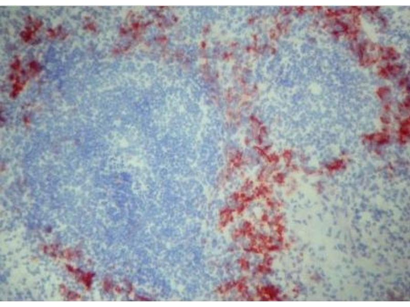 Immunohistchemistry on Frozen Sections: 0.5 μg/mL (1/600). Does not react on routinely processed Paraffin sections. Recommended Positive Control: Mouse spleen. Has been described to work in FACS. Other applications not tested. Optimal dilutions are dependent on conditions and should be determined by the user.