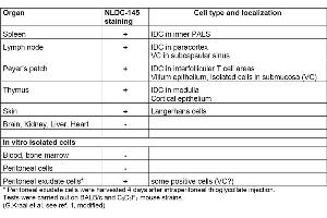 Reacts with nonlymphoid dendritic cells: interdigitating cells (IDC), veiled cells and Langerhans cells, thymic epithelial cells. Monoclonal antibody NLDC-145 identifies Ia positive interdigitating cells, veiled cells and Langerhans cells of the skin and their in vitro counterparts. The antigen is expressed at high levels by dendritic cells and thymic epithelial cells. The antigen detected by NLDC-145 is an integral membrane glycoprotein with an apparent mass of 205 kDa, also known as DEC-205.