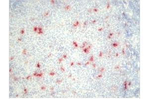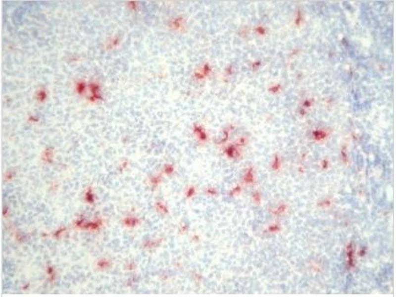 Immunohistochemistry on Frozen Sections: 1 μg/mL (1/200). Immunohistochemistry on Paraffin Sections: 2 μg/mL (1/100). Proteinase K pretreatmentfor antigen retrieval recommended. Suggested Positive Control: Human tonsil. The antibody is suitable for staining macrophages from bronchial lavage fluids and similartechniques. It is very useful for macrophage phenotyping, particularly for the classificationof late inflammatory stages (together with the anti calprotectin clone 27E10 and the antiCD163 clone 5C6-FAT). It is used in tissue sections and in smears, for the characterization of tumorous tissues andthe monitoring of macrophage cell cultures.