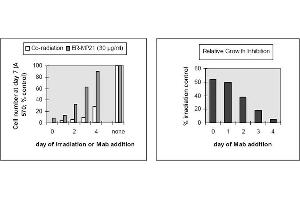 ER-MP21 stains proliferating cells of all types as well as cells taking up iron for special needs, such as late erythroid precursors and some mature macrophages. The antibody inhibits the iron uptake and the proliferation of macrophage precursors from bone marrow and early macrophage precursor cell lines. ER-MP21 recognizes the transferrin receptor but does not compete with transferrin binding. Specific for mouse transferring receptor. The antigen is a 200 kDa protein (non-reducing conditions) consisting of two identical chains. The recognized epitope of the receptor is not located at the transferrin binding site. Antigen Distribution: Macrophage progeny at day 7 in bone marrow cultures, treated in parallel on various days by irradiation (1500 rad 60Co γ-radiation) or addition of ER-MP21 (30 μg/mL final concentration). Cell numbers were quantified using the MTT assay and expressed relative to untreated controls. Relative growth inhibition calculated from data represented in left figure. For mAb- or radiation treated cultures, the number of cell cycles needed to reach the cell number in untreated controls was calculated. Values obtained for irradiated cultures were taken as 100 % inhibition controls and values for ER-MP21 - treated cultures were expressed relative to these (See Figure 1.)