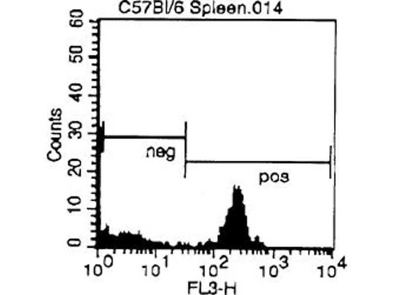 - FLOW CYTOMETRY ANALYSIS: 1. Prepare a cell suspension in media A. For cell preparations, deplete the red blood cellpopulation with Lympholyte®-M cell separation medium. 2. Wash 2 times. 3. Resuspend the cells to a concentration of 2x10e7 cells/ml in media A. Add 50 µl of thissuspension to each tube (each tube will then contain 1 x 10e6 cells, representing 1 test). 4. To each tube, add ~1. 0 µg* of this Ab per 10e6 cells. 5. Vortex the tubes to ensure thorough mixing of antibody and cells. 6. Incubate the tubes for 30 minutes at 4°C. (It is recommended that the tubes areprotected from light, since most fluorochromes are light sensitive. )7. Wash 2 times at 4°C. 8. Resuspend the cell pellet in 50 µl ice cold media B. 9. Transfer to suitable tubes for flow cytometric analysis containing 15 µl of propidiumiodide at 0. 5 mg/ml in PBS. This stains dead cells by intercalating in DNA. MEDIA: A. Phosphate buffered saline (pH 7. 2) + 5% normal serum of host species + sodium azide(100 µl of 2M sodium azide in 100 mls). B. Phosphate buffered saline (pH 7. 2) + 0. 5% Bovine serum albumin + sodium azide (100µl of 2M sodium azide in 100 mls). Tissue Distribution by Flow Cytometry Analysis: Mouse Strain: BALB/cCell Concentration: 1x10e6 cells per testAntibody Concentration Used: 1. 0 µg/10e6 cellsIsotypic Control: PE Rat IgG2a