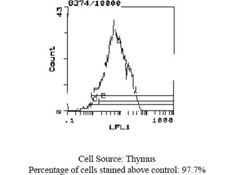 FLOW CYTOMETRY ANALYSIS: Method: 1. Prepare a cell suspension in media A. For cell preparations, deplete the red blood cellpopulation with Lympholyte®-M cell separation medium. 2. Wash 2 times. 3. Resuspend the cells to a concentration of 2x10e7 cells/ml in media A. Add 50 µl of thissuspension to each tube (each tube will then contain 1 x 10e6 cells, representing 1 test). 4. To each tube, add 0. 1 - 0. 2 µg* of this Ab per 10e6 cells. 5. Vortex the tubes to ensure thorough mixing of antibody and cells. 6. Incubate the tubes for 30 minutes at 4°C. 7. Wash 2 times at 4°C. 8. Add 100 µl of secondary antibody (Streptavidin-FITC) at a 1: 500 dilution. 9. Incubate tubes at 4°C for 30 - 60 minutes. 10. Wash 2 times at 4°C. 11. Resuspend the cell pellet in 50 µl ice cold media B. 12. Transfer to suitable tubes for flow cytometric analysis containing 15 µl of propidiumiodide at 0. 5 mg/ml in PBS. This stains dead cells by intercalating in DNA. Media: A. Phosphate buffered saline (pH 7. 2) + 5% normal serum of host species + sodium azide(100 µl of 2M sodium azide in 100 mls). B. Phosphate buffered saline (pH 7. 2) + 0. 5% Bovine serum albumin + sodium azide (100µl of 2M sodium azide in 100 mls). Results - Tissue DistributionMouse Strain: BALB/cCell Concentration: 1x10e6 cells per testsAntibody Concentration Used: 0. 1 µg/10e6 cellsIsotypic Control: Biotin Mouse IgG2b,kResults - Strain DistributionCell Concentration: 1x10e6 cells per testsAntibody Concentration Used: 0. 1 µg/10e6 cellsStrains Tested: BALB/C, C3H/He, CBA/J, AKR, ATHPositive: BALB/C, AKR, ATHNegative: C3H/He, CBA/J