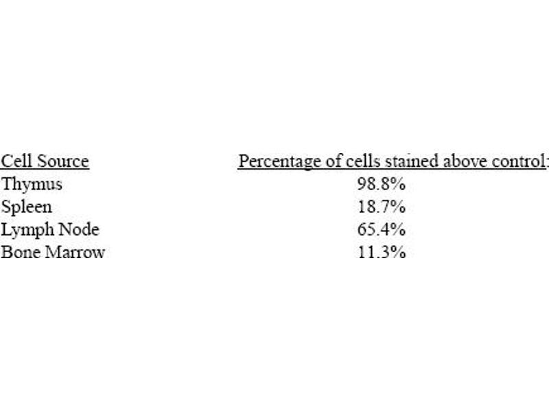 FLOW CYTOMETRY ANALYSIS: Method: 1. Prepare a cell suspension in media A. For cell preparations, deplete the red blood cellpopulation with Lympholyte®-M cell separation medium. 2. Wash 2 times. 3. Resuspend the cells to a concentration of 2x10e7 cells/ml in media A. Add 50 µl of thissuspension to each tube (each tube will then contain 1 x 10e6 cells, representing 1 test). 4. To each tube, add 0. 5 µg* of this Ab per 10e6 cells. 5. Vortex the tubes to ensure thorough mixing of antibody and cells. 6. Incubate the tubes for 30 minutes at 4°C. (It is recommended that the tubes areprotected from light, since most fluorochromes are light sensitive. )7. Wash 2 times at 4°C. 8. Resuspend the cell pellet in 50 µl ice cold media B. 9. Transfer to suitable tubes for flow cytometric analysis containing 15 µl of propidiumiodide at 0. 5 mg/ml in PBS. This stains dead cells by intercalating in DNA. Media: A. Phosphate buffered saline (pH 7. 2) + 5% normal serum of host species + sodium azide(100 µl of 2M sodium azide in 100 mls). B. Phosphate buffered saline (pH 7. 2) + 0. 5% Bovine serum albumin + sodium azide (100µl of 2M sodium azide in 100 mls). Results - Tissue DistributionMouse Strain: BALB/cCell Concentration: 1x10e6 cells per testsAntibody Concentration Used: 0. 5 µg/10e6 cellsIsotypic Control: PE Mouse IgG2b