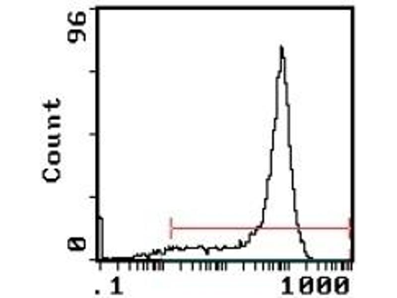 - FLOW CYTOMETRY ANALYSIS: Method: 1. Prepare a cell suspension in media A. For cell preparations, deplete the red blood cellpopulation with Lympholyte®-M cell separation medium. 2. Wash 2 times. 3. Resuspend the cells to a concentration of 2x10e7 cells/ml in media A. Add 50 µl of thissuspension to each tube (each tube will then contain 1 x 10e6 cells, representing 1 test). 4. To each tube, add 0. 1-0. 2 µg* of this Ab per 10e6 cells. 5. Vortex the tubes to ensure thorough mixing of antibody and cells. 6. Incubate the tubes for 30 minutes at 4°C. 7. Wash 2 times at 4°C. 8. Add 100 µl of secondary antibody (Streptavidin-FITC) at a 1: 500 dilution. 9. Incubate tubes at 4°C for 30 - 60 minutes (It is recommended that tubes are protectedfrom light since most fluorochromes are light sensitive). 10. Wash 2 times at 4°C. 11. Resuspend the cell pellet in 50 µl ice cold media B. 12. Transfer to suitable tubes for flow cytometric analysis containing 15 µl of propidiumiodide at 0. 5 mg/ml in PBS. The stains dead cells by intercalating in DNA. Media: A. Phosphate buffered saline (pH 7. 2) + 5% normal serum of host species + sodium azide(100 µl of 2M sodium azide in 100 mls). B. Phosphate buffered saline (pH 7. 2) + 0. 5% Bovine serum albumin + sodium azide (100µl of 2M sodium azide in 100 mls). Results - Tissue DistributionMouse Strain: BALB/cCell Concentration: 1x10e6 cells per testsAntibody Concentration Used: 0. 2 µg/10e6 cellsIsotypic Control: Biotin Rat IgG2bResults - Strain DistributionCell Concentration: 1x10e6 cells per testsAntibody Concentration Used: 0. 2 µg/10e6 cellsStrains Tested: BALB/c, CBA/J, C3H/He,C57BL/6Positive: BALB/c, CBA/J, C3H/He,C57BL/6Negative: none