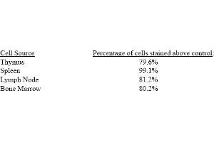 - FLOW CYTOMETRY ANALYSIS: Method: 1. Prepare a cell suspension in media A. For cell preparations, deplete the red blood cellpopulation with Lympholyte®-M cell separation medium. 2. Wash 2 times. 3. Resuspend the cells to a concentration of 2x10e7 cells/ml in media A. Add 50 µl of thissuspension to each tube (each tube will then contain 1x10e6 cells, representing 1 test). 4. To each tube, add 0. 5 µg* of this Ab. 5. Vortex the tubes to ensure thorough mixing of antibody and cells. 6. Incubate the tubes for 30 minutes at 4°C. 7. Wash 2 times at 4°C. 8. Add 100 µl of secondary antibody (FITC Goat anti-rat IgG (H+L)) at 1/500 dilution. 9. Incubate the tubes at 4°C for 30-60 minutes. (It is recommended that the tubes areprotected from light since most fluorochromes are light sensitive). 10. Wash 2 times at 4°C in media B. 11. Resuspend the cell pellet in 50 µl ice cold media B. 12. Transfer to suitable tubes for flow cytometric analysis containing 15 µl of propidiumiodide at 0. 5 mg/ml in PBS. This stains dead cells by intercalating in DNA. Media: A. Phosphate buffered saline (pH 7. 2) + 5% normal serum of host species + sodium azide(100 µl of 2M sodium azide in 100 mls). B. Phosphate buffered saline (pH 7. 2) + 0. 5% Bovine serum albumin + sodium azide (100µl of 2M sodium azide in 100 mls). Results - Tissue Distribution: Mouse Strain: BALB/cCell Concentration: 1x10e6 cells per testAntibody Concentration Used: 0. 5 µg/10e6 cellsIsotypic Control: Rat IgG2aResults - Strain Distribution: Cell Concentration: 1x10e6 cells per testAntibody Concentration Used: 0. 5 µg/10e6 cellsStrains Tested: BALB/C, CBA/J, C3H/He, C57BL/6, SWRPositive: BALB/C, CBA/J, C3H/He, C57BL/6, SWRNegative: none