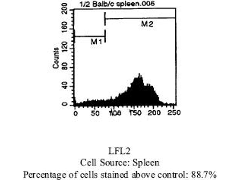 - FLOW CYTOMETRY ANALYSIS: Method: 1. Prepare a cell suspension in media A. For cell preparations, deplete the red blood cellpopulation with Lympholyte®-M cell separation medium. 2. Wash 2 times. 3. Resuspend the cells to a concentration of 2x10e7 cells/ml in media A. Add 50 µl of thissuspension to each tube (each tube will then contain 1 x 10e6 cells, representing 1 test). 4. To each tube, add ~0. 25µg* of this Ab per 10e6 cells. 5. Vortex the tubes to ensure thorough mixing of antibody and cells. 6. Incubate the tubes for 30 minutes at 4°C. 7. Wash 2 times at 4°C. 8. Add 100 µl of secondary antibody (Streptavidin-PE) at a 1: 50 dilution. 9. Incubate tubes at 4°C for 30 - 60 minutes (It is recommended that tubes are protectedfrom light since most fluorochromes are light sensitive). 10. Wash 2 times at 4°C. 11. Resuspend the cell pellet in 50 µl ice cold media B. 12. Transfer to suitable tubes for flow cytometric analysis containing 15 µl of propidiumiodide at 0. 5 mg/ml in PBS. This stains dead cells by intercalating in DNA. Media: A. Phosphate buffered saline (pH 7. 2) + 5% normal serum of host species + sodium azide(100 µl of 2M sodium azide in 100 mls). B. Phosphate buffered saline (pH 7. 2) + 0. 5% Bovine serum albumin + sodium azide (100µl of 2M sodium azide in 100 mls). Results - Tissue Distribution: Mouse Strain: BALB/cCell Concentration: 1x10e6 cells per testAntibody Concentration Used: 0. 25 µg/10e6 cellsIsotypic Control: Biotin Rat IgG2b