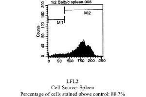 - FLOW CYTOMETRY ANALYSIS: Method: 1. Prepare a cell suspension in media A. For cell preparations, deplete the red blood cellpopulation with Lympholyte®-M cell separation medium. 2. Wash 2 times. 3. Resuspend the cells to a concentration of 2x10e7 cells/ml in media A. Add 50 µl of thissuspension to each tube (each tube will then contain 1 x 10e6 cells, representing 1 test). 4. To each tube, add ~0. 25µg* of this Ab per 10e6 cells. 5. Vortex the tubes to ensure thorough mixing of antibody and cells. 6. Incubate the tubes for 30 minutes at 4°C. 7. Wash 2 times at 4°C. 8. Add 100 µl of secondary antibody (Streptavidin-PE) at a 1: 50 dilution. 9. Incubate tubes at 4°C for 30 - 60 minutes (It is recommended that tubes are protectedfrom light since most fluorochromes are light sensitive). 10. Wash 2 times at 4°C. 11. Resuspend the cell pellet in 50 µl ice cold media B. 12. Transfer to suitable tubes for flow cytometric analysis containing 15 µl of propidiumiodide at 0. 5 mg/ml in PBS. This stains dead cells by intercalating in DNA. Media: A. Phosphate buffered saline (pH 7. 2) + 5% normal serum of host species + sodium azide(100 µl of 2M sodium azide in 100 mls). B. Phosphate buffered saline (pH 7. 2) + 0. 5% Bovine serum albumin + sodium azide (100µl of 2M sodium azide in 100 mls). Results - Tissue Distribution: Mouse Strain: BALB/cCell Concentration: 1x10e6 cells per testAntibody Concentration Used: 0. 25 µg/10e6 cellsIsotypic Control: Biotin Rat IgG2b