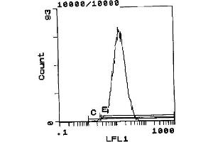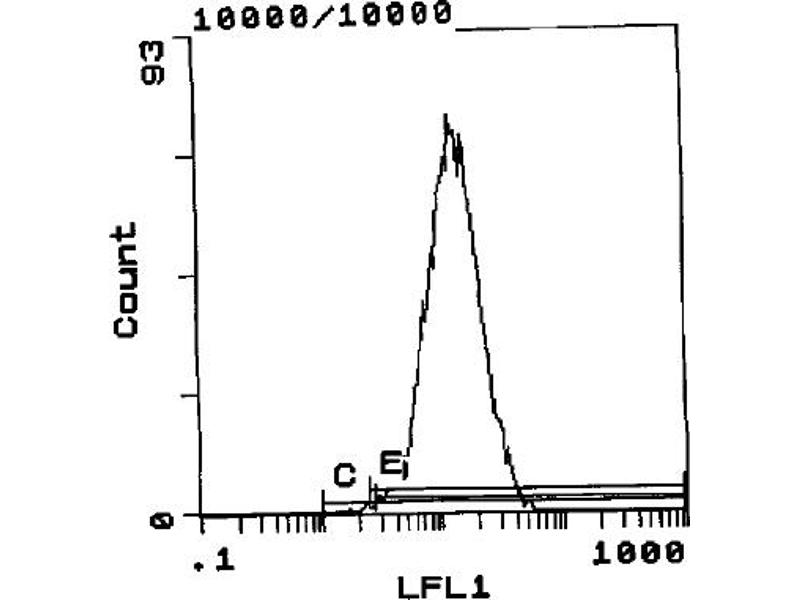 FLOW CYTOMETRY ANALYSIS: Method: 1. Prepare a cell suspension in media A. For cell preparations, deplete the red blood cellpopulation with cell separation medium. 2. Wash 2 times. 3. Resuspend the cells to a concentration of 2x10e7 cells/ml in media A. Add 50 µl of thissuspension to each tube (each tube will then contain 1x10e6 cells, representing 1 test). 4. To each tube, add 0. 5-1. 0 µg* of ABIN114228. 5. Vortex the tubes to ensure thorough mixing of antibody and cells. 6. Incubate the tubes for 30 minutes at 4°C. 7. Wash 2 times at 4°C. 8. Add 100 µl of secondary antibody (FITC Goat anti-rat IgG (H+L)) at a 1/500 dilution. 9. Incubate the tubes at 4°C for 30-60 minutes. (It is recommended that the tubes are protected from light since most fluorochromes arelight sensitive). 10. Wash 2 times at 4°C in media B. 11. Resuspend the cell pellet in 50 µl ice cold media B. 12. Transfer to suitable tubes for flow cytometric analysis containing 15 µl of propidiumiodide at 0. 5 mg/ml in PBS. This stains dead cells by intercalating in DNA. Media: A. Phosphate buffered saline (pH 7. 2) + 5% normal serum of host species + sodium azide(100 µl of 2M sodium azide in 100 mls). B. Phosphate buffered saline (pH 7. 2) + 0. 5% Bovine serum albumin + sodium azide (100µl of 2M sodium azide in 100 mls).