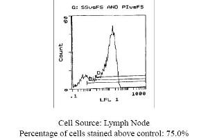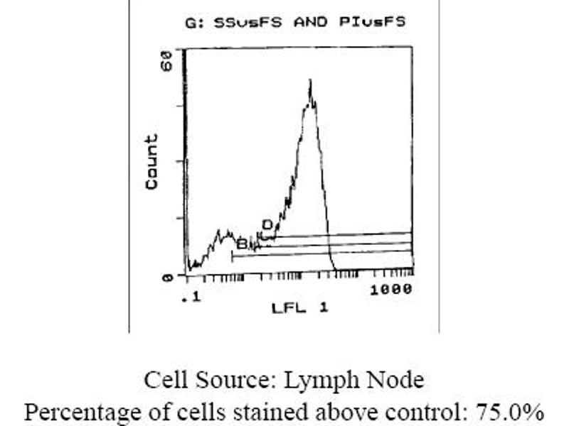 FLOW CYTOMETRY ANALYSIS: Method: 1. Prepare a cell suspension in media A. For cell preparations, deplete the red blood cellpopulation with Lympholyte®-M cell separation medium. 2. Wash 2 times. 3. Resuspend the cells to a concentration of 2x10e7 cells/ml in media A. Add 50 µl of thissuspension to each tube (each tube will then contain 1x10e6 cells, representing 1 test). 4. To each tube, add 0. 1-0. 2 µg* of this Ab. 5. Vortex the tubes to ensure thorough mixing of antibody and cells. 6. Incubate the tubes for 30 minutes at 4°C. 7. Wash 2 times at 4°C. 8. Add 100 µl of secondary antibody (FITC Goat anti-rat IgG (H+L)) at 1: 500 dilution. 9. Incubate the tubes at 4°C for 30-60 minutes. (It is recommended that the tubes areprotected from light since most fluorochromes are light sensitive). 10. Wash 2 times at 4°C in media B. 11. Resuspend the cell pellet in 50 µl ice cold media B. 12. Transfer to suitable tubes for flow cytometric analysis containing 15 µl of propidiumiodide at 0. 5 mg/ml in PBS. This stains dead cells by intercalating in DNA. Media: A. Phosphate buffered saline (pH 7. 2) + 5% normal serum of host species + sodium azide(100 µl of 2M sodium azide in 100 mls). B. Phosphate buffered saline (pH 7. 2) + 0. 5% Bovine serum albumin + sodium azide (100µl of 2M sodium azide in 100 mls). Results - Tissue Distribution: Mouse Strain: BALB/cCell Concentration: 1x10e6 cells per testAntibody Concentration Used: 0. 2 µg/10e6 cellsIsotypic Control: Rat IgG2aCell Source: Percentage of cells stained above controlThymus: 85. 8%Spleen: 41. 0%Lymph Node: 75. 0%Results - Strain Distribution: