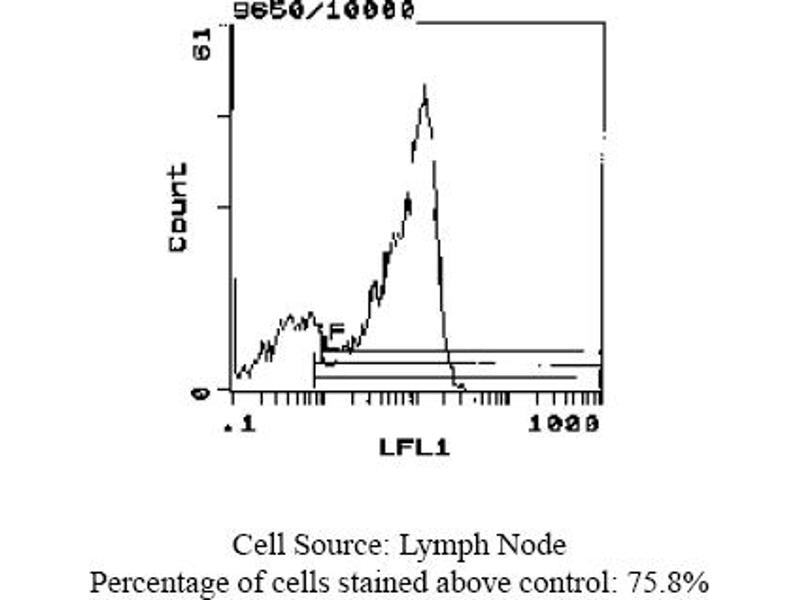 FLOW CYTOMETRY ANALYSIS: Method: 1. Prepare a cell suspension in media A. For cell preparations, deplete the red blood cellpopulation with Lympholyte®-M cell separation medium. 2. Wash 2 times. 3. Resuspend the cells to a concentration of 2x10e7 cells/ml in media A. Add 50 µl of thissuspension to each tube (each tube will then contain 1 x 10e6 cells, representing 1 test). 4. To each tube, add 0. 1-0. 2 µg* of this Ab per 10e6 cells. 5. Vortex the tubes to ensure thorough mixing of antibody and cells. 6. Incubate the tubes for 30 minutes at 4°C. 7. Wash 2 times at 4°C. 8. Add 100 µl of secondary antibody (Streptavidin-FITC) at a 1: 500 dilution. 9. Incubate tubes at 4°C for 30 - 60 minutes (It is recommended that tubes are protectedfrom light since most fluorochromes are light sensitive). 10. Wash 2 times at 4°C. 11. Resuspend the cell pellet in 50 µl ice cold media B. 12. Transfer to suitable tubes for flow cytometric analysis containing 15 µl of propidiumiodide at 0. 5 mg/ml in PBS. This stains dead cells by intercalating in DNA. Media: A. Phosphate buffered saline (pH 7. 2) + 5% normal serum of host species + sodium azide(100 µl of 2M sodium azide in 100 mls). B. Phosphate buffered saline (pH 7. 2) + 0. 5% Bovine serum albumin + sodium azide (100µl of 2M sodium azide in 100 mls). Results - Tissue Distribution: Mouse Strain: BALB/cCell Concentration: 1x10e6 cells per testAntibody Concentration Used: 0. 2 µg/10e6 cellsIsotypic Control: Biotin Rat IgG2aCell Source: Percentage of cells stained above controlThymus: 59. 8%Spleen: 66. 3%Lymph Node: 75. 8%