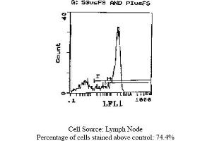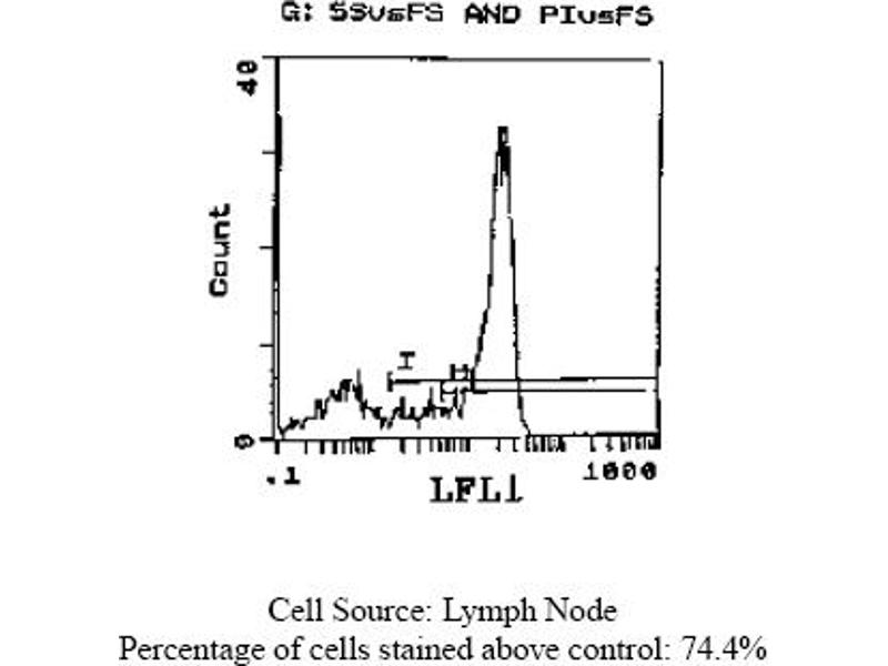 FLOW CYTOMETRY ANALYSIS: Method: 1. Prepare a cell suspension in media A. For cell preparations, deplete the red blood cellpopulation with Lympholyte®-M cell separation medium. 2. Wash 2 times. 3. Resuspend the cells to a concentration of 2x10e7 cells/ml in media A. Add 50 µl of thissuspension to each tube (each tube will then contain 1x10e6 cells, representing 1 test). 4. To each tube, add 0. 2 - 0. 5 µg* of this Ab per 10e6 cells. 5. Vortex the tubes to ensure thorough mixing of antibody and cells. 6. Incubate the tubes for 30 minutes at 4°C. (It is recommended that the tubes areprotected from light, since most flurochromes are light sensitive). 7. Wash 2 times at 4°C. 8. Resuspend the cell pellet in 50 µl ice cold media B. 9. Transfer to suitable tubes for flow cytometric analysis containing 15 µl of propidiumiodide at 0. 5 mg/ml in PBS. This stains dead cells by intercalating in DNA. Media: A. Phosphate buffered saline (pH 7. 2) + 5% normal serum of host species + sodium azide(100 µl of 2M sodium azide in 100 mls). B. Phosphate buffered saline (pH 7. 2) + 0. 5% Bovine serum albumin + sodium azide (100µl of 2M sodium azide in 100 mls). Results - Tissue Distribution by: Mouse Strain: BALB/cCell Concentration: 1x10e6 cells per testAntibody Concentration Used: 0. 2 µg/10e6 cellsIsotypic Control: FITC Rat IgG2aCell Source: Percentage of cells stained above control: Thymus: 88. 8%Spleen: 36. 6%Lymph Node: 74. 4%Strain Distribution: Cell Concentration: 1x10e6 cells per testAntibody Concentration Used: 0. 2 µg/10e6 cells