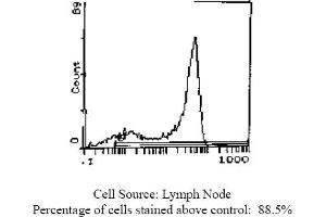 FLOW CYTOMETRY ANALYSIS: Method: 1. Prepare a cell suspension in media A. For cell preparations, deplete the red blood cellpopulation with Lympholyte®-M cell separation medium. 2. Wash 2 times. 3. Resuspend the cells to a concentration of 2x10e7 cells/ml in media A. Add 50 µl of thissuspension to each tube (each tube will then contain 1x10e6 cells, representing 1 test). 4. To each tube, add 0. 5-1. 0 µg* of this Ab per 10e6 cells. 5. Vortex the tubes to ensure thorough mixing of antibody and cells. 6. Incubate the tubes for 30 minutes at 4°C. (It is recommended that the tubes areprotected from light since most fluorochromes are light sensitive). 7. Wash 2 times at 4°C. 8. Resuspend the cell pellet in 50 µl ice cold media B. 9. Transfer to suitable tubes for flow cytometric analysis containing 15 µl of propidiumiodide at 0. 5 mg/ml in PBS. This stains dead cells by intercalating in DNA. Media: A. Phosphate buffered saline (pH 7. 2) + 5% normal serum of host species + sodium azide(100 µl of 2M sodium azide in 100 mls). B. Phosphate buffered saline (pH 7. 2) + 0. 5% Bovine serum albumin + sodium azide (100µl of 2M sodium azide in 100 mls). Results - Tissue Distribution: Mouse Strain: BALB/cCell Concentration: 1x10e6 cells per testAntibody Concentration Used: 1. 0 µg/10e6 cellsIsotypic Control: PE Rat IgG2aCell Source: Percentage of cells stained above control: Thymus: 89. 1%Spleen: 34. 8%Lymph Node: 88. 5%Results - Strain Distribution: Cell Concentration: 1x10e6 cells per testAntibody Concentration Used: 1. 0 µg/10e6 cellsStrains Tested: BALB/c, CBA/J, C3H/He, C57BL/6, AKR