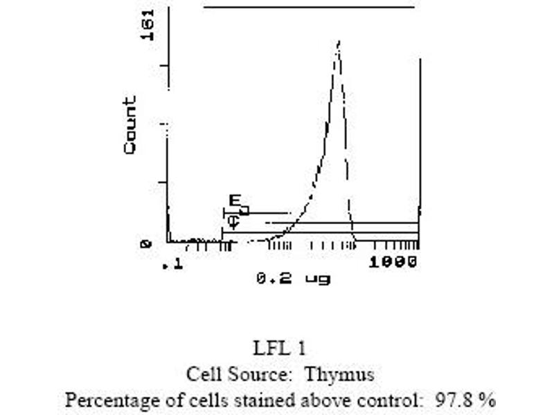 - FLOW CYTOMETRY ANALYSIS: Method: 1. Prepare a cell suspension in media A. For cell preparations, deplete the red blood cellpopulation. 2. Wash 2 times. 3. Resuspend the cells to a concentration of 2x10e7 cells/ml in media A. Add 50 µl of thissuspension to each tube (each tube will then contain 1 x 10e6 cells, representing 1 test). 4. To each tube, add 0. 2-0. 5 µg of this antibody per 10e6 cells. 5. Vortex the tubes to ensure thorough mixing of antibody and cells. 6. Incubate the tubes for 30 minutes at 4°C. 7. Wash 2 times at 4°C. 8. Add 100 µl of secondary antibody (Streptavidin-FITC) at a 1/500 dilution. 9. Incubate tubes at 4°C for 30-60 minutes (It is recommended that tubes are protectedfrom light since most fluorochromes are light sensitive). 10. Wash 2 times at 4°C. 11. Resuspend the cell pellet in 50 µl ice cold media B. 12. Transfer to suitable tubes for flow cytometric analysis containing 15 µl of propidiumiodide at 0. 5 mg/ml in PBS. This stains dead cells by intercalating in DNA. Media: A. Phosphate buffered saline (pH 7. 2) + 5% normal serum of host species + sodium azide(100 µl of 2M sodium azide in 100 mls). B. Phosphate buffered saline (pH 7. 2) + 0. 5% Bovine serum albumin + sodium azide (100µl of 2M sodium azide in 100 mls). Results: Tissue Distribution by Flow Cytometry Analysis: Mouse Strain: CBA/JCell Concentration : 1x10e6 cells per testsAntibody Concentration Used: 0. 2 µg/10e6 cellsIsotypic Control: Biotin Mouse IgG2b,kCell Source: Percentage of cells stained above control: Thymus: 97. 8%Spleen: 35. 4%