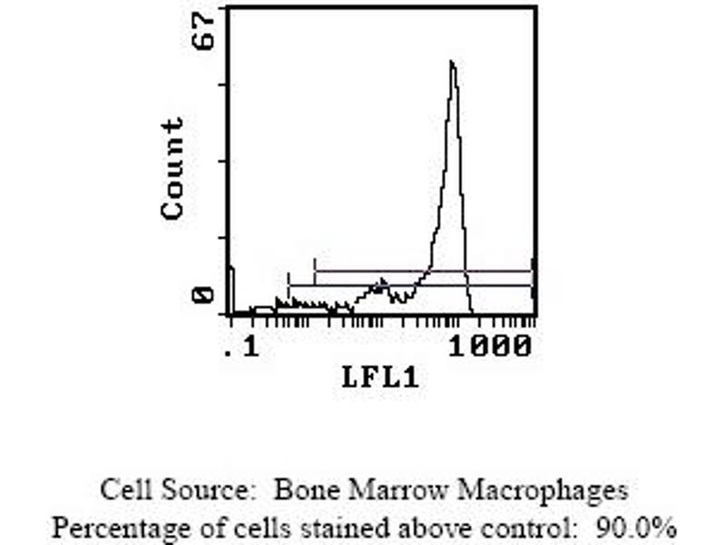 FLOW CYTOMETRY ANALYSIS: Method: 1. Prepare a cell suspension in media A. For cell preparations, deplete the red blood cellpopulation. 2. Wash 2 times. 3. Resuspend the cells to a concentration of 2x10e7 cells/ml in media A. Add 50 µl of thissuspension to each tube (each tube will then contain 1 x 10e6 cells, representing 1 test). 4. To each tube, add 0. 1 - 0. 5 µg of antibody per 10e6 cells. 5. Vortex the tubes to ensure thorough mixing of antibody and cells. 6. Incubate the tubes for 30 minutes at 4°C. (It is recommended that the tubes areprotected from light, since most fluorochromes are light sensitive. )7. Wash 2 times at 4°C. 8. Resuspend the cell pellet in 50 µl ice cold media B. 9. Transfer to suitable tubes for flow cytometric analysis containing 15 µl of propidiumiodide at 0. 5 mg/ml in PBS. This stains dead cells by intercalating in DNA. Media: A. Phosphate buffered saline (pH 7. 2) + 5% normal serum of host species + sodium azide(100 µl of 2M sodium azide in 100 mls). B. Phosphate buffered saline (pH 7. 2) + 0. 5% Bovine serum albumin + sodium azide (100µl of 2M sodium azide in 100 mls). Results: Tissue Distribution by Flow Cytometry Analysis: Mouse Strain: CBA/JCell Concentration : 1x10e6 cells per testAntibody Concentration Used: 0. 1 µg/10e6 cellsIsotypic Control: FITC Rat IgG2bCell Source Percentage of cells stained above control: Thymus 1. 5%Whole Blood Monocytes 87. 2%Bone Marrow Macrophages 90. 0%(see picture below)Strain Distribution by Flow Cytometry Analysis: Procedure: see aboveCell Concentration: 1x10e6 cells per test