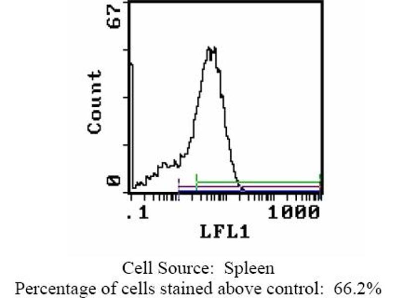 - FLOW CYTOMETRY ANALYSIS: Method: 1. Prepare a cell suspension in media A. For cell preparations, deplete the red blood cellpopulation with Lympholyte®-Rat cell separation medium. 2. Wash 2 times. 3. Resuspend the cells to a concentration of 2x10e7 cells/ml in media A. Add 50 µl of thissuspension to each tube (each tube will then contain 1x10e6 cells, representing 1 test). 4. To each tube, add 1. 0-0. 5 µg* of this Ab. 5. Vortex the tubes to ensure thorough mixing of antibody and cells. 6. Incubate the tubes for 30 minutes at 4°C. 7. Wash 2 times at 4°C. 8. Add 100 µl of secondary antibody (Streptavidin-FITC) at 1: 500 dilution. 9. Incubate the tubes at 4°C for 30-60 minutes. (It is recommended that the tubes areprotected from light since most fluorochromes are light sensitive). 10. Wash 2 times at 4°C in media B. 11. Resuspend the cell pellet in 50 µl ice cold media B. 12. Transfer to suitable tubes for flow cytometric analysis containing 15 µl of propidiumiodide at 0. 5 mg/ml in PBS. This stains dead cells by intercalating in DNA. Media: A. Phosphate buffered saline (pH 7. 2) + 5% normal serum of host species + sodium azide(100 µl of 2M sodium azide in 100 mls). B. Phosphate buffered saline (pH 7. 2) + 0. 5% Bovine serum albumin + sodium azide (100µl of 2M sodium azide in 100 mls). Results - Tissue Distribution: Rat Strain: WistarCell Concentration: 1 x 10e6 cells per testAntibody Concentration Used: 0. 5 µg/10e6 cellsIsotypic Control: Biotin Mouse IgG2aCell Source Percentage of cells stained above control: